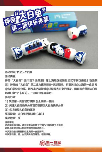 创意虽然简单,消费者却很惊喜。在目前还少有企业尝试的情况下,优质国货的创新大家仍然很期待,也愿意捧场。巨白兔目前是上海第一食品门店的当红炸子鸡,而在更萌的大白兔优盘周边的推动下,巨白兔想必还会更火一把。当过往记忆的见证与灵活的网络营销趣味结合,不由我们不中招!